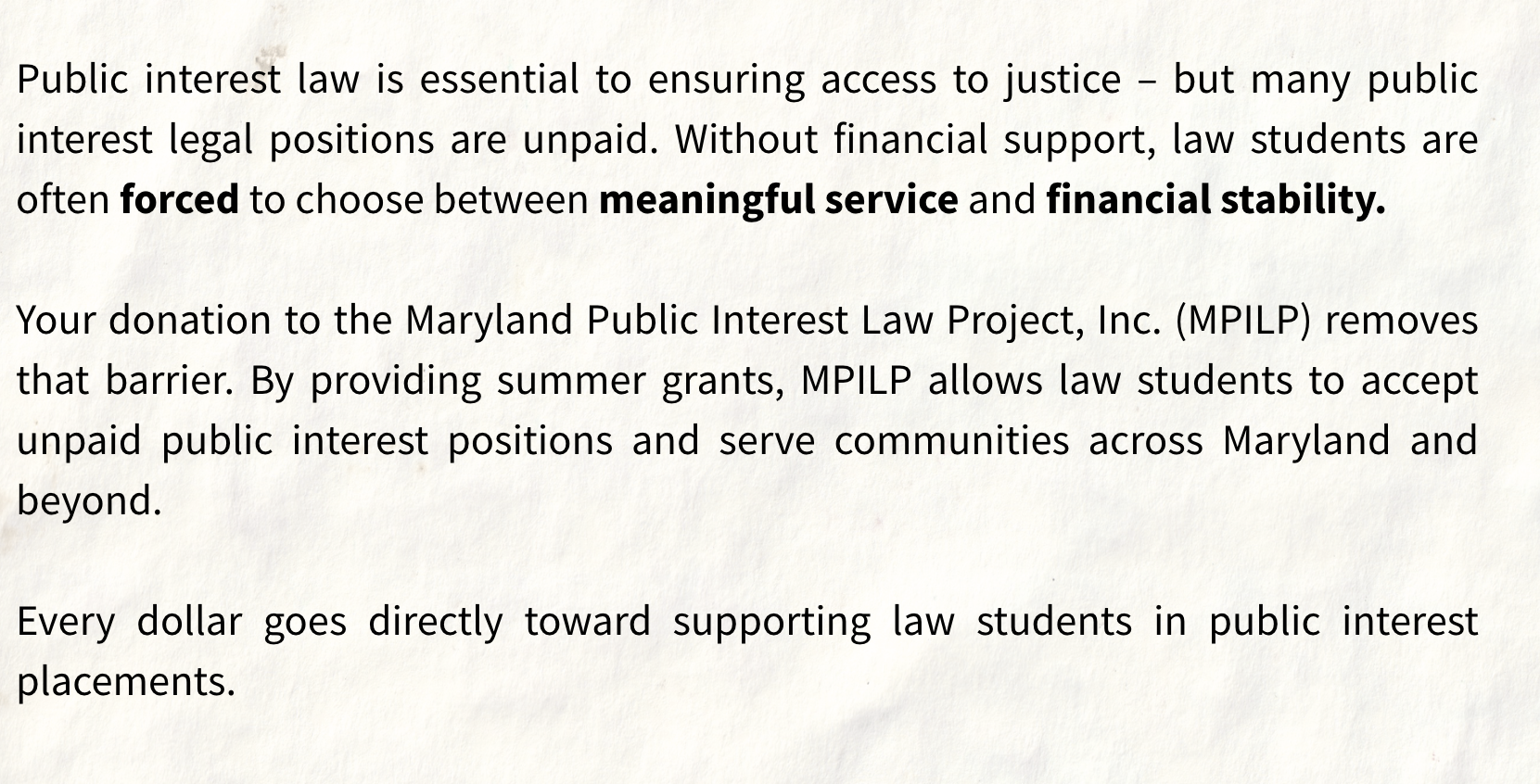 The Maryland Public Interest Law Project is a 501(c)(3) non-profit organization. For your tax preparation purposes, our Federal EIN is 52-1620485. Your donation is tax deductible to the fullest extent of the law. Please consult your personal accountant for the tax value to your specific situation.